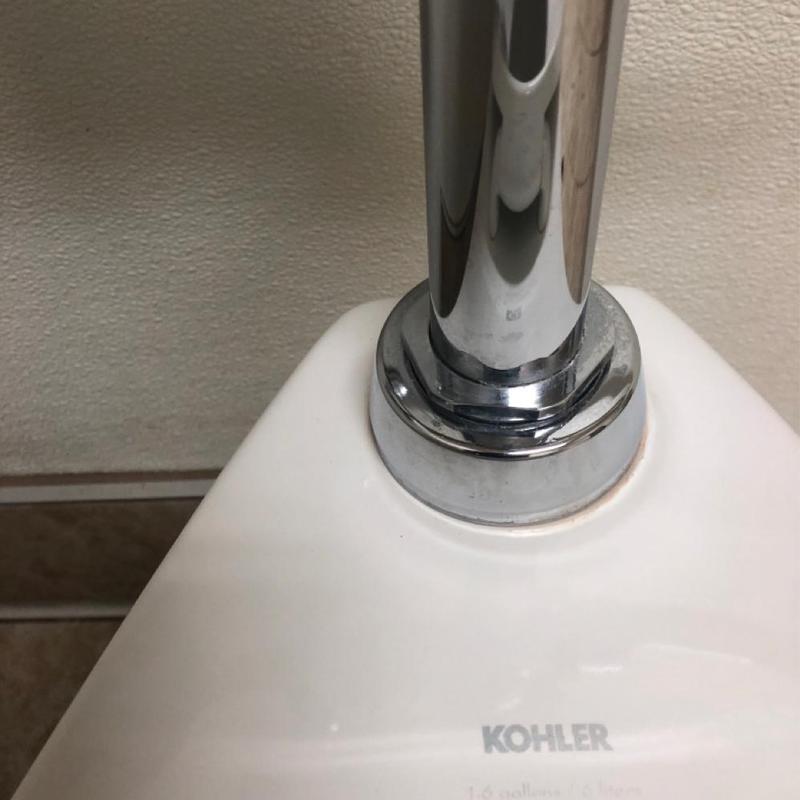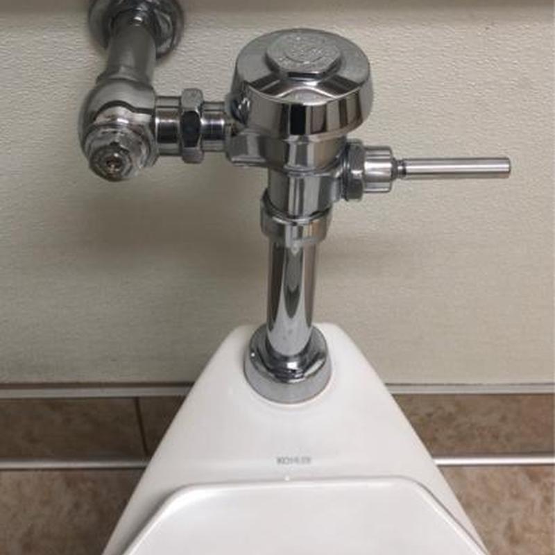 Plumbers repaired a spud leak in a men’s restroom in Fresno, California. They tightened the nut near the spud to stop water from gushing. After the repair, they flushed the system multiple times to confirm the leak was fully resolved.